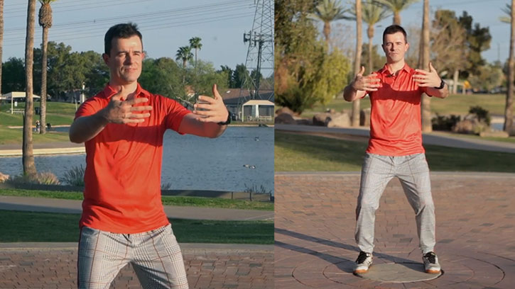 - Raise your hands to chest height with your palms facing your body and your fingers pointing toward each other. Let your arms form a relaxed circle with your elbows hanging slightly lower than your hands. Don’t reach or stretch; relax your shoulders and round your shoulder blades.