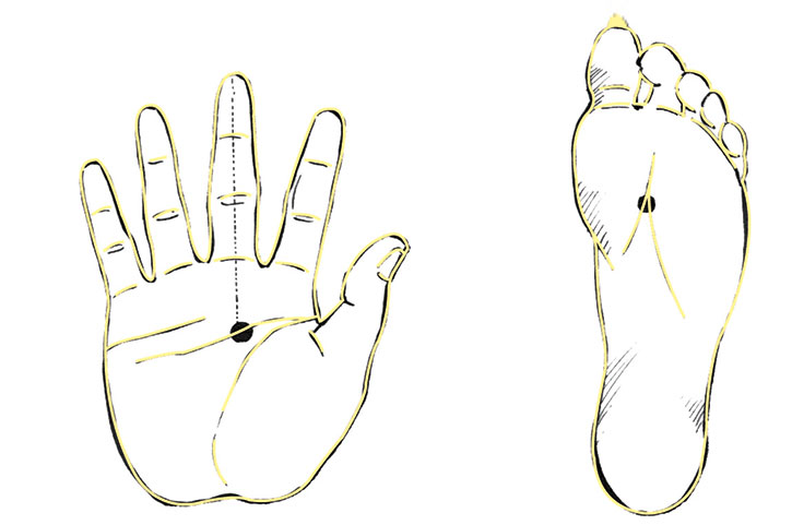 This walking style allows us to take in and move energy. First, we feel four energy centers on the surface of our body. Two lie on the palms of our hands (jangshim) and two on the soles of our feet (yongchun). We keep our focus on these centers as we walk. Feeling our yongchun means that energy gathers in our knees and pelvis. It helps to walk with our feet parallel to each other, like the number 11.